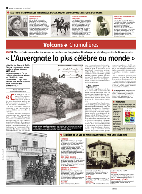 L’ouvrage s’appuie sur un livre de souvenirs écrit par La Marie Quinton "Le Journal de la Belle Meunière" paru en 1895 présente une très importante recherche iconographique qui se décline autour des dernières années de Boulanger et de Royat-les-Bains. Par ailleurs on dispose de photos niçoises : des portraits du studio Cauvin ainsi que de son Palace et restaurant que tenait La Quinton à Nice.