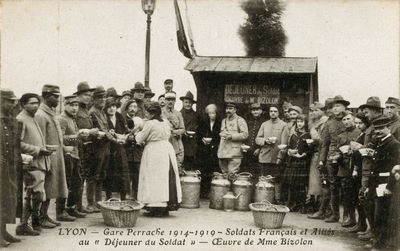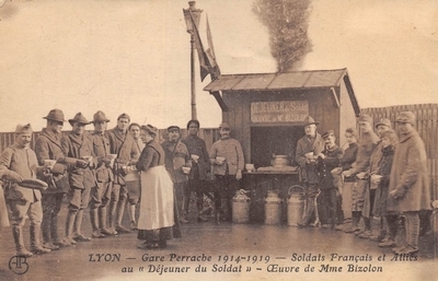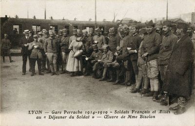 Pour parler, comme elle le mérite, de cette bonne Lyonnaise, si grande et pourtant si simple, dans sa tenue modeste de femme du peuple, il nous faudrait un cadre beaucoup plus vaste que celui de ces rapides esquisses, forcément incomplètes. Mais rassurons-nous : point n’est besoin de retracer l’histoire si touchante de cette œuvre toute de dévouement : « Le Déjeuner du Soldat » fonctionna durant toute la guerre à la gare Perrache ; Mme Bizolon, non seulement, en fut l’instigatrice généreuse, mais aussi, la bonne fée, prodiguant jusqu’au dernier jour, sa peine et ses maigres ressources aux militaires de passage dans notre ville.