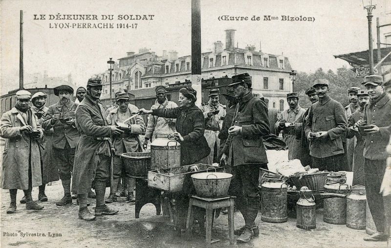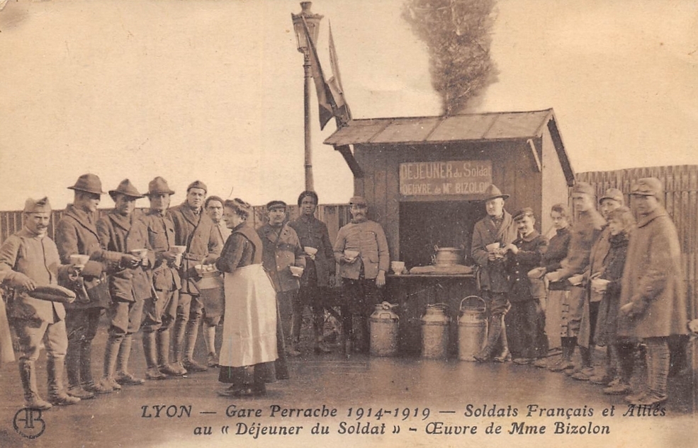 Devant la gare de Perrache, la Mairie fait construire un abri en planches et en zinc, avec un comptoir extérieur, un guichet et une cheminée pour accueillir l’énorme cafetière. La Mère Bizolon devient désormais l’une des figures les plus populaires de la capitale des Gaules. Sa générosité et son engagement dépassent les frontières et résonnent sur le sol français. On publia par millier des cartes postales on l’on voit cette Mère Lyonnaise d’exception en action. Une buvette est un préfabriqué provisoire, La Mère Bizolon y servit pendant la guerre un verre, une soupe, du café, du thé, du chocolat, du pain et des gourmandises. Les bouillons et saucissons de La Mère Bizolon ne seraient pas qu’une légende. Les soupes à l’oignon qu’elle servait aux soldats, étaient « monnaie courante ». Tout comme dans les « Bouchons Lyonnais », les assiettes de charcuterie, un plat chaud faisaient son affaire. Rien de bien compliqué, la simplicité des lieux et les bourses démunies qu’elle incarne, ne justifiaient pas de plats élaborés.