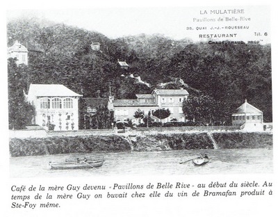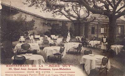 « Située près du confluent du Rhône et de la Saône, 35 quai Jean-Jacques Rousseau à La Mulatière, l'enseigne de "La Mère Guy" est la plus vénérable de l'agglomération lyonnaise, car c'est la seule qui subsistait des premiers restaurants du XVIIIe siècle ! Du vivant de Paul Bocuse »