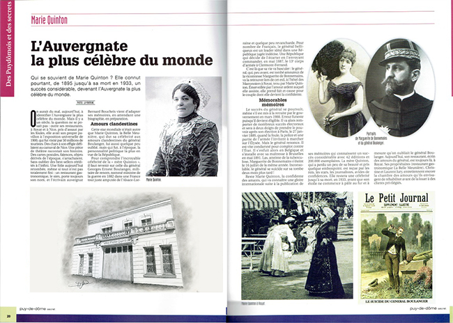 L’ouvrage s’appuie sur un livre de souvenirs écrit par La Marie Quinton "Le Journal de la Belle Meunière" paru en 1895 présente une très importante recherche iconographique qui se décline autour des dernières années de Boulanger et de Royat-les-Bains. Par ailleurs on dispose de photos niçoises : des portraits du studio Cauvin ainsi que de son Palace et restaurant que tenait La Quinton à Nice.