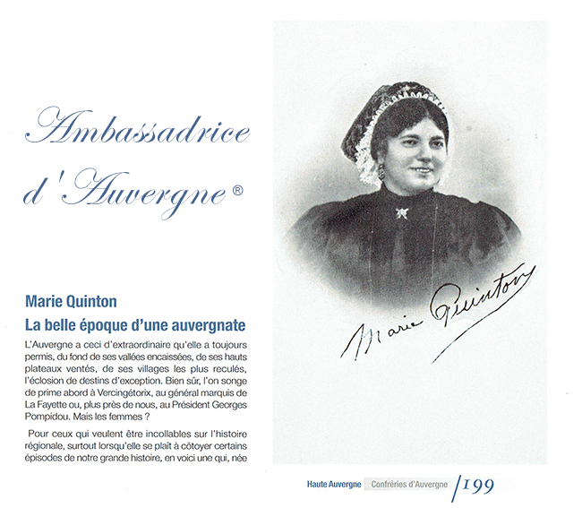 Grâce à un cadre de recherche très méticuleux, l’ouvrage fait surgir de l’Histoire auvergnate ce personnage inoubliable en la personne de Marie Quinton, veuve au caractère bien trempé ! Vêtue d’un costume au fil d’or qu’elle revendique, cette hôtelière possède de tels talents d’accueil dans son Auberge des Marronniers de Royat-Les-Bains que toute la France curiste s’invite chez elle, et, qui plus est, arrive par le train nouvellement créé !