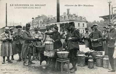 Pour parler, comme elle le mérite, de cette bonne Lyonnaise, si grande et pourtant si simple, dans sa tenue modeste de femme du peuple, il nous faudrait un cadre beaucoup plus vaste que celui de ces rapides esquisses, forcément incomplètes. Mais rassurons-nous : point n’est besoin de retracer l’histoire si touchante de cette œuvre toute de dévouement : « Le Déjeuner du Soldat » fonctionna durant toute la guerre à la gare Perrache ; Mme Bizolon, non seulement, en fut l’instigatrice généreuse, mais aussi, la bonne fée, prodiguant jusqu’au dernier jour, sa peine et ses maigres ressources aux militaires de passage dans notre ville.