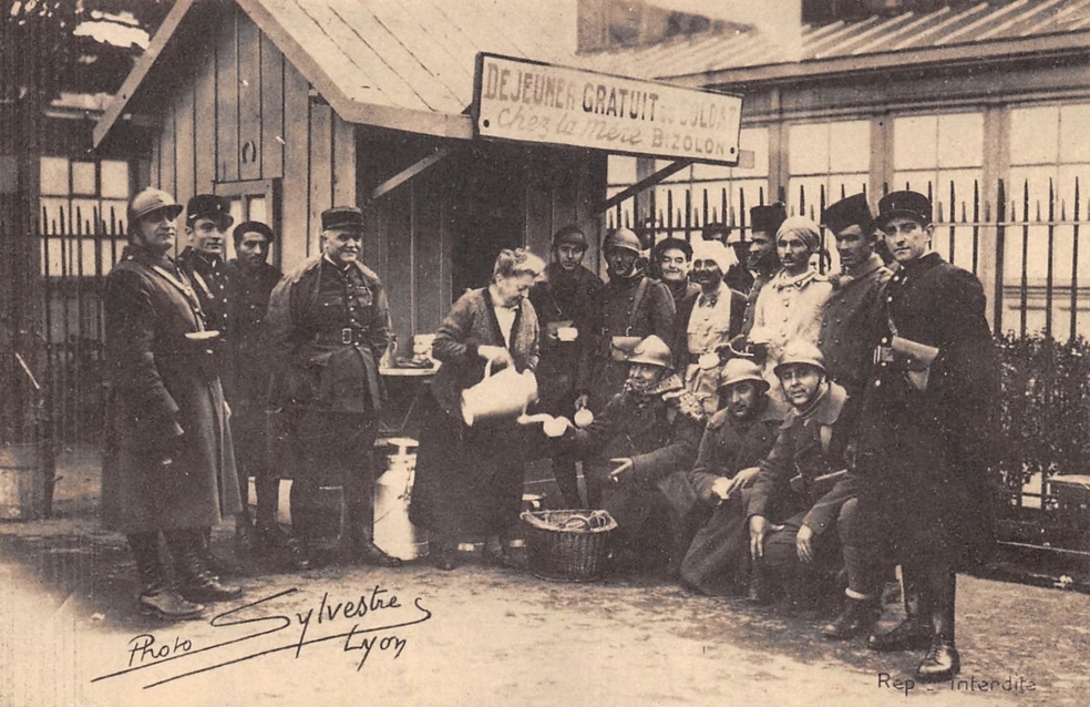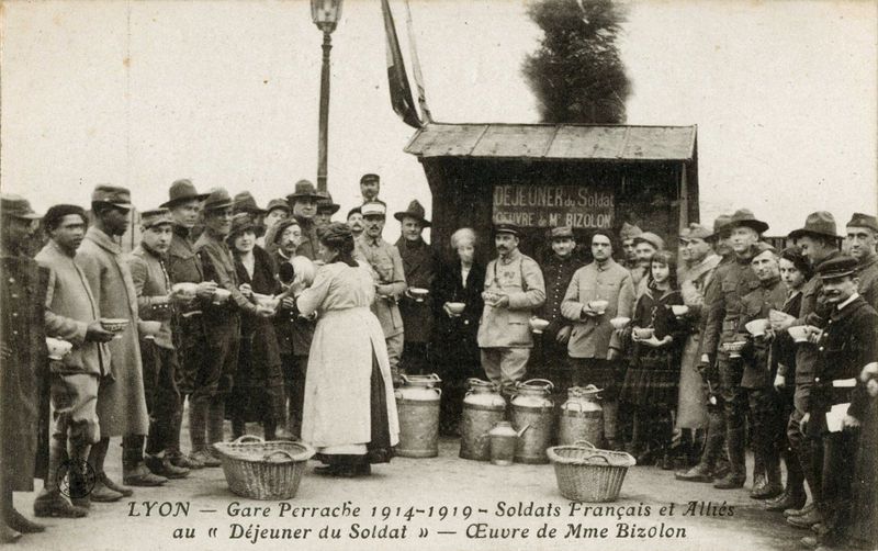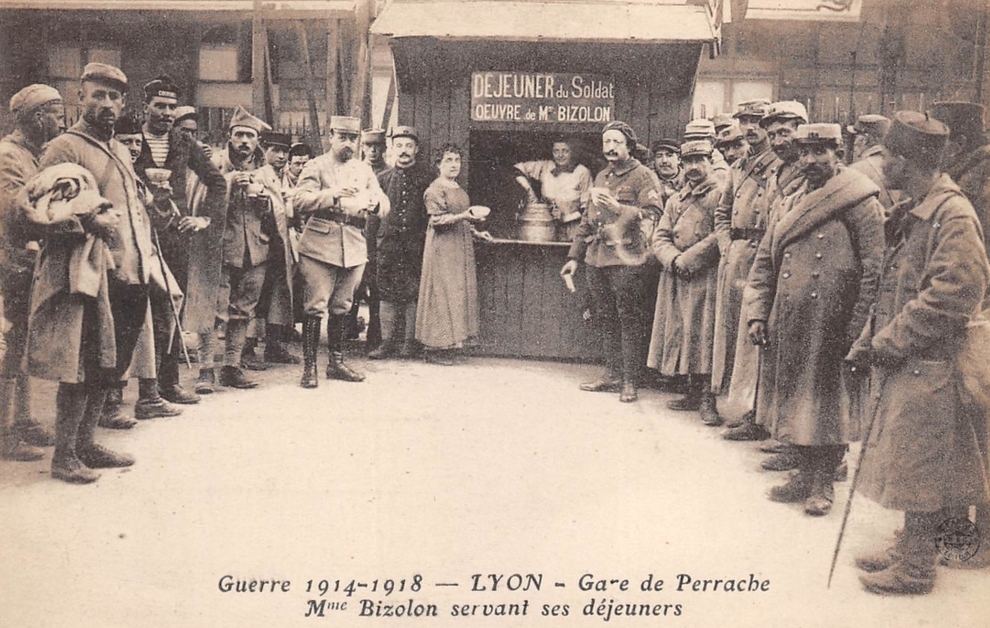 Devant la gare de Perrache, la Mairie fait construire un abri en planches et en zinc, avec un comptoir extérieur, un guichet et une cheminée pour accueillir l’énorme cafetière. La Mère Bizolon devient désormais l’une des figures les plus populaires de la capitale des Gaules. Sa générosité et son engagement dépassent les frontières et résonnent sur le sol français. On publia par millier des cartes postales on l’on voit cette Mère Lyonnaise d’exception en action. Une buvette est un préfabriqué provisoire, La Mère Bizolon y servit pendant la guerre un verre, une soupe, du café, du thé, du chocolat, du pain et des gourmandises. Les bouillons et saucissons de La Mère Bizolon ne seraient pas qu’une légende. Les soupes à l’oignon qu’elle servait aux soldats, étaient « monnaie courante ». Tout comme dans les « Bouchons Lyonnais », les assiettes de charcuterie, un plat chaud faisaient son affaire. Rien de bien compliqué, la simplicité des lieux et les bourses démunies qu’elle incarne, ne justifiaient pas de plats élaborés.