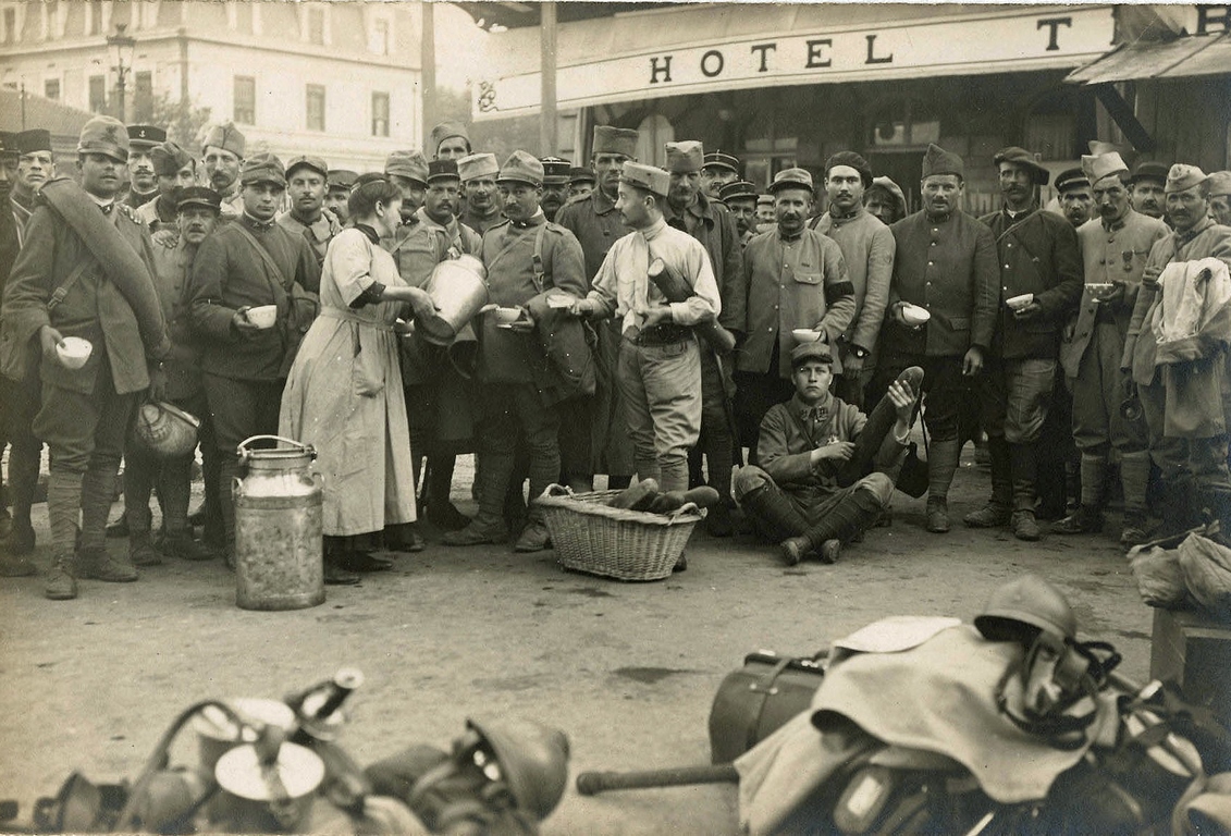 « Une vraie Femme de France … Un groupe de ces soldats se presse autour d’un primitif buffet improvisé : deux chaises supportant une planche, des brocs contenant l’un du café fumant, l’autre du chocolat, et une brouette contenant du pain et la provision de chocolat, de café et de sucre, ainsi qu’un panier rempli de vieux bois et de tasses dépareillées. Ce buffet en plein vent est tenu par une frêle petite créature, une femme du peuple, en vêtements de travail : tablier bleu, fichu noir, pas de chapeau. C’est Madame Bizolon. Elle est là depuis quatre heures du matin, et jusqu’à midi … elle distribue des boissons chaudes, gratuitement, aux soldates de passage … Sa tâche terminée, la brave dame Bizolon en entreprend une autre : celle d’aller quêter en ville pour son œuvre. Car l’excellente personne n’a pas de fortune ; nous l’avons dit, c’est une femme du peuple, mais une de ces femmes au cœur de mère, bonne, généreuse, sensible à la souffrance d’autrui, calme et forte dans l’accomplissement du devoir qu’elle s’est imposé, inspirée seulement par le souvenir de celui qu’elle adorait, de son cher fils qu’ils lui ont tué là-bas ! « Oui, c’est pour lui que je viens ici tous les matins » dit-elle, et, à travers ses larmes, filtre un sourire pour les soldats qu’elle continue d’inviter : « Venez, venez, mon brave petit chasseur : chocolat, café ? … Non, ici on ne paie pas … » Article de Marcel d’Acanthe dans un journal local de 1917