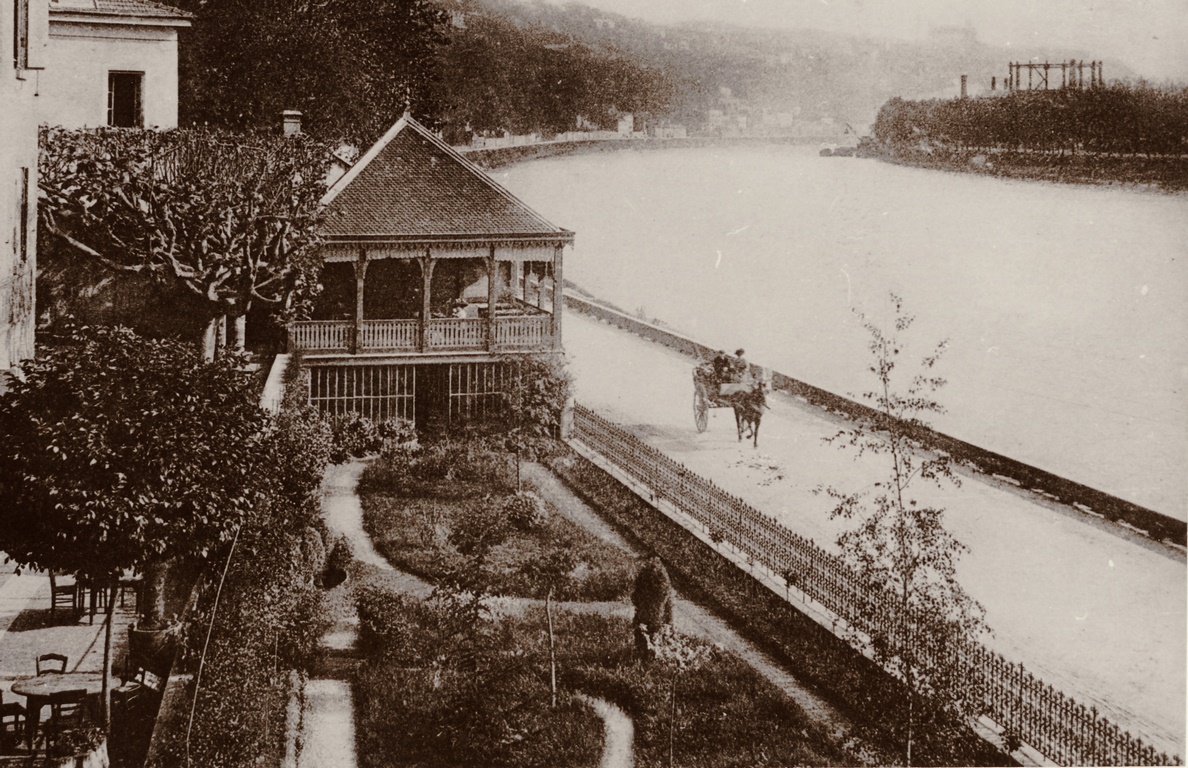 C'est la Saône qui coule aujourd'hui devant l'emplacement de La Mère Guy. Une telle mutation fluviale s'expliquant par le fait qu'à l'époque l'ingénieur Perrache n'avait pas encore commencé les travaux gigantesques qui devaient repousser le fameux confluent du quartier d'Ainey jusqu'à la Mulatière.